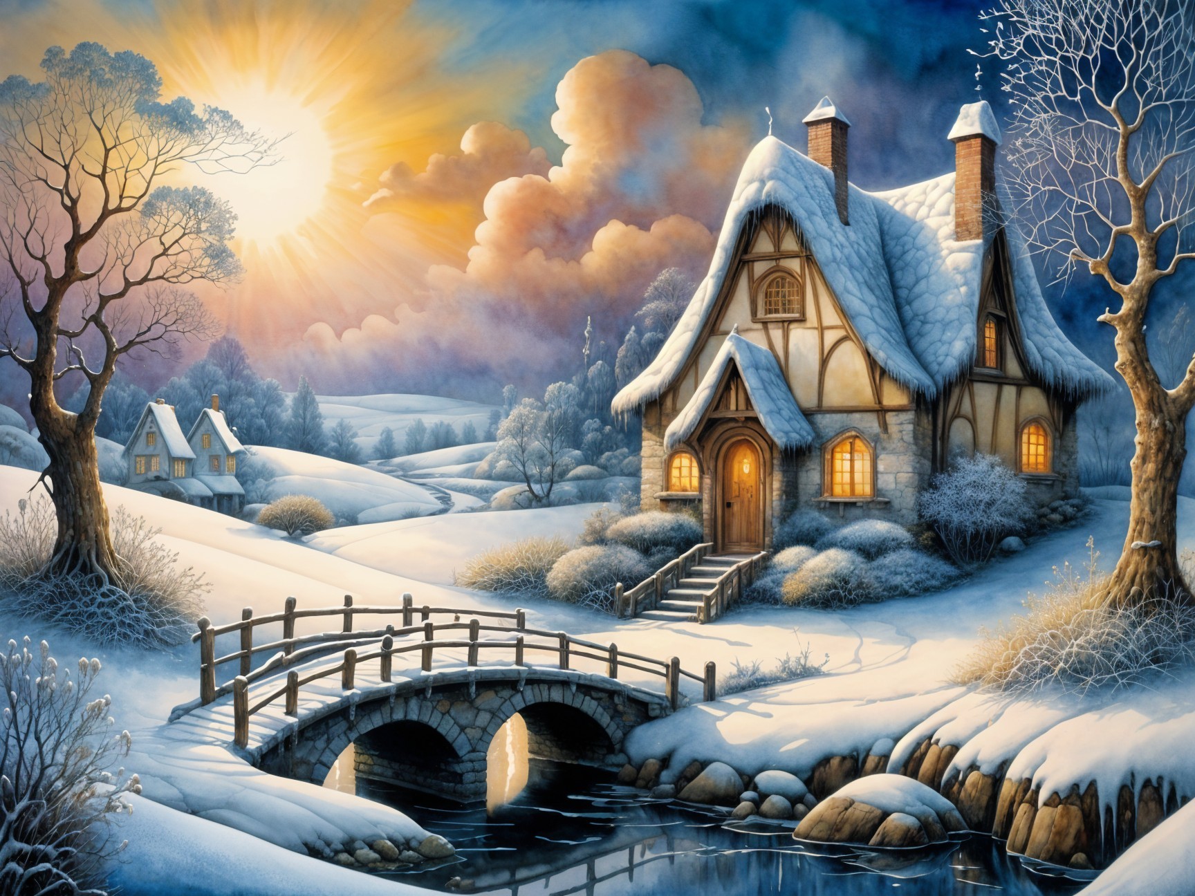 A picturesque winter landscape painting rendered in watercolor style depicts a charming fairytale cottage, with light emanating from its windows and doorway, at the center of the image. The cottage features an intricate timber-frame design with textured stucco walls, and its roof is heavily blanketed in pristine white snow, adorned with ic