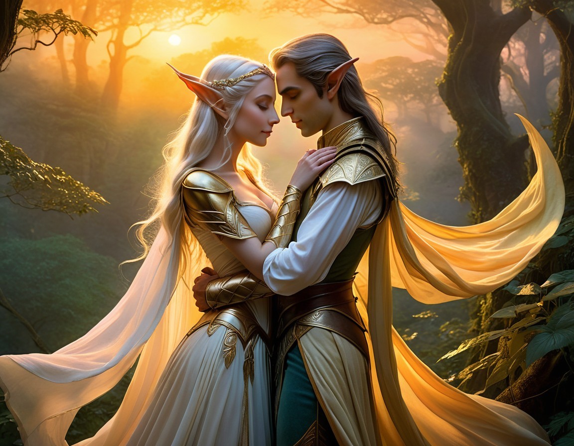 Prompt: "Enchanting high elf couple, ethereal and elegant, romantic embrace, intricate elven attire, flowing garments, pointed ears, the female is almost nude, mystical forest backdrop, dense treetops, lush canopy, vibrant sunset hues, soft mist swirling below, magical ambiance, fantasy setting, detailed and enchanting illustration, warm and soft lighting, golden hour glow, by Brian Froud and Alan Lee, Artstation."