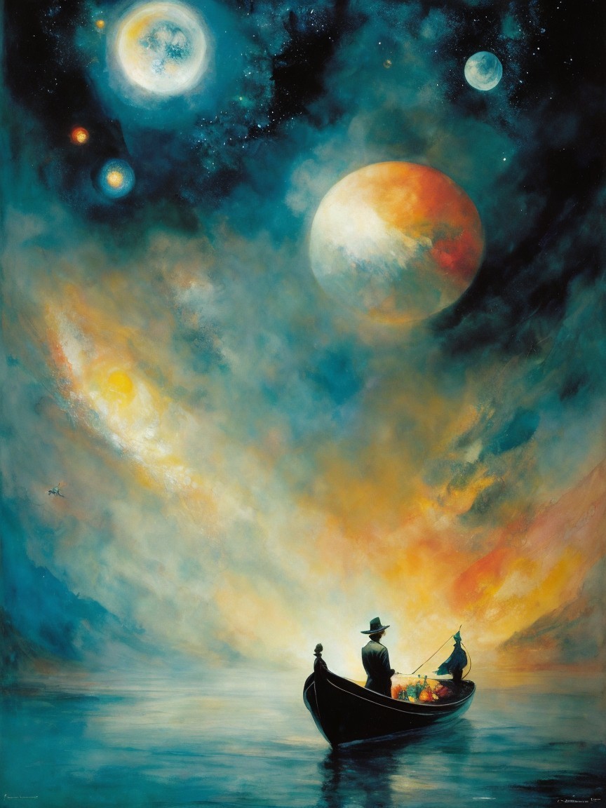 A serene cosmic scene features a small boat floating on tranquil waters, under a vast sky filled with vibrant planets and swirling colors, evoking a sense of wonder and exploration.
