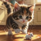 Playful Kitten Chasing Mouse on Sunlit Floor