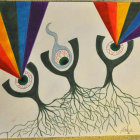 The image features vibrant, swirling colors forming the shapes of three eyes, surrounded by abstract patterns. The design is dynamic and evokes a sense of depth and emotion.