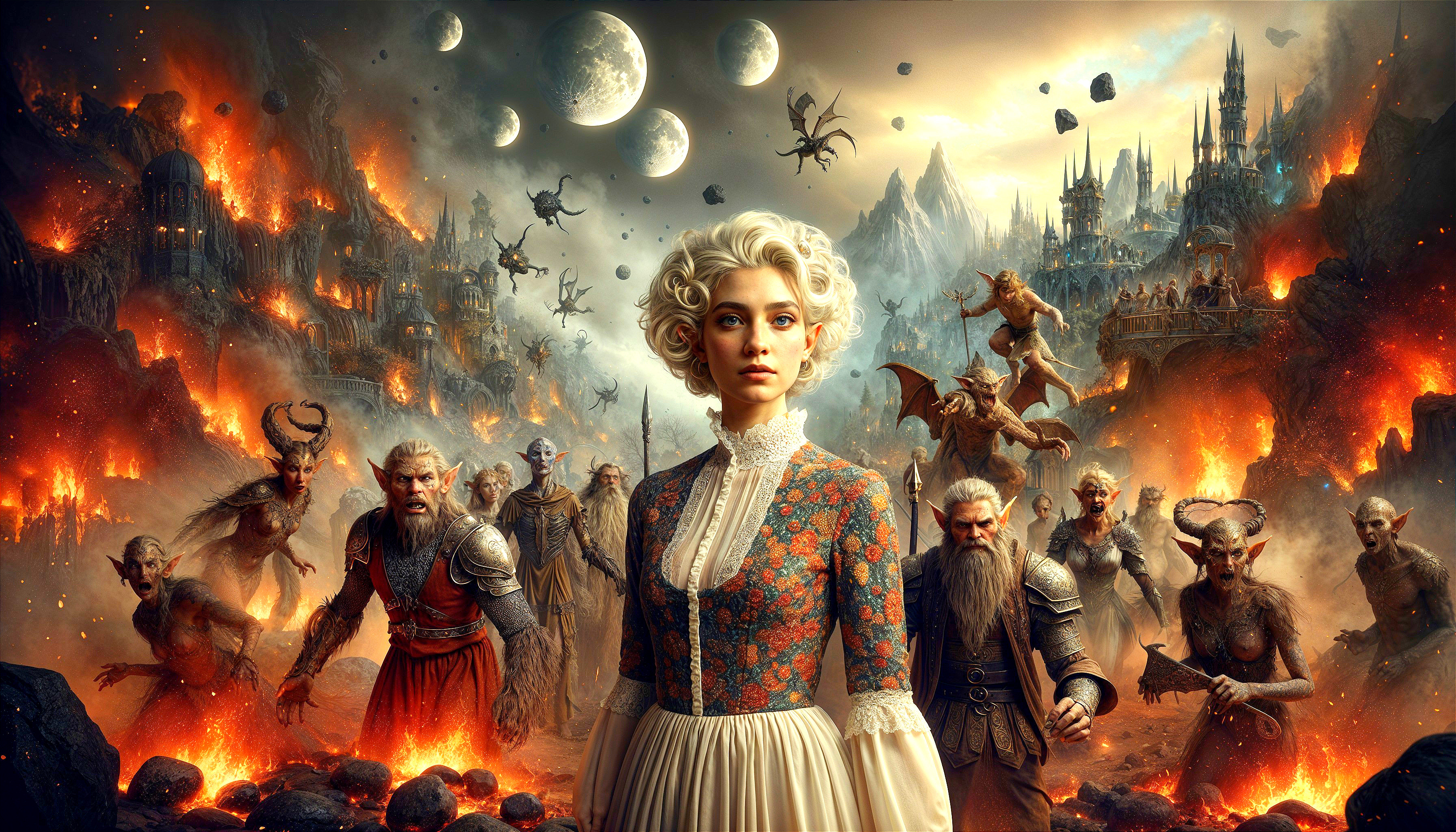 A stunning artwork inspired by the styles of Waterhouse and Klimt, featuring a medieval fantasy scene with elves, ents, monsters, and multiple moons. The piece is hyper-detailed, hyper-realistic, and meticulously crafted with ornate details and muted colors. The composition includes elements like meteors falling, cinematic lighting, and a bright studio