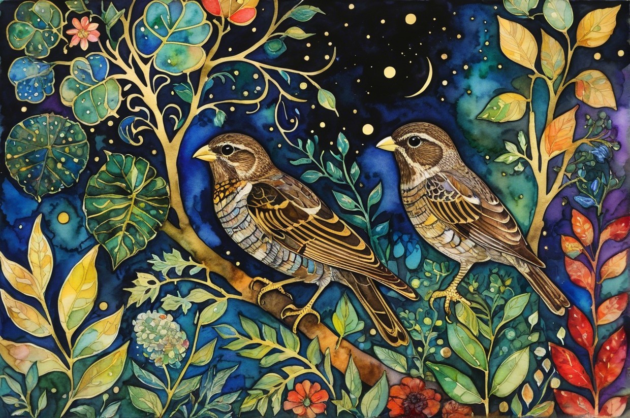 Detailed Birds on Branch Amidst Vibrant Foliage and Sky