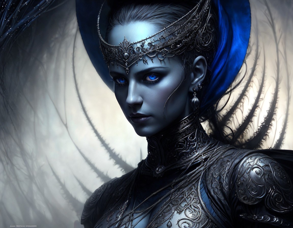 Tomasz Alen Kopera, Jean-Paul Monge, Tom Bagshaw,  Imagine a character from the game Of Light And Darkness  created by Gil Bruvel. Fantasy. Magic. Photorealistic. Very intricate pattern. Black metal. Digital painting. Sharp focus. Deep blue eyes. H. R. Giger. Very inticate.  fractal.  Filigree