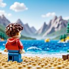 A young boy in steampunk attire stands on a sandy shore, gazing at a vibrant river. In the background, whimsical, industrial structures rise among lush greenery under a bright sky.