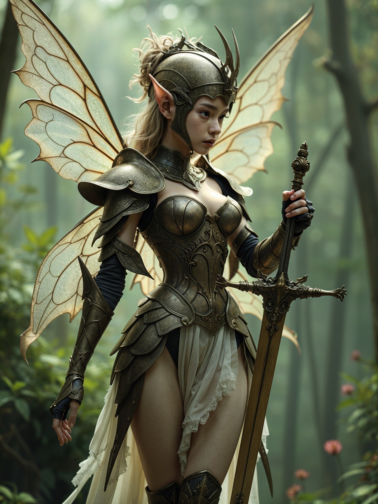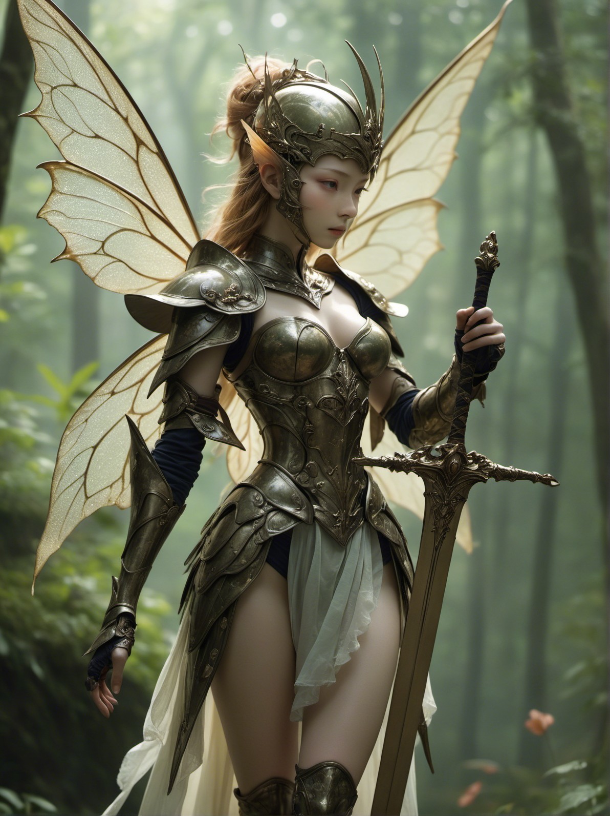 A majestic fairy warrior stands in a lush forest. She wears intricate armor with elegant wings, holding a sword. The ethereal atmosphere is enhanced by soft, dappled sunlight filtering through trees.