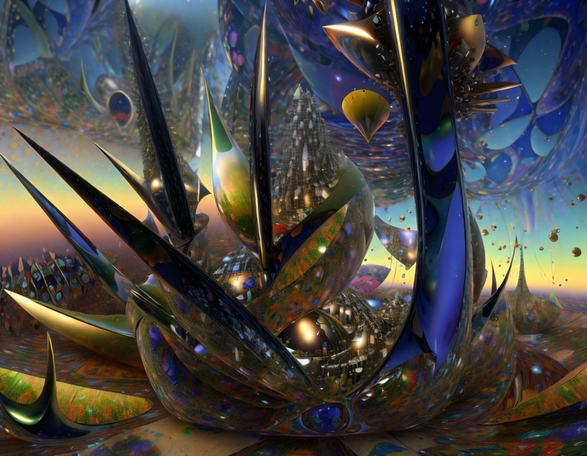 A surreal digital artwork featuring smooth, metallic structures and droplets in a dream-like, reflective landscape under a gradient sky.