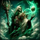 Skeletal Figure in Armor with Fiery Staff and Stormy Sky