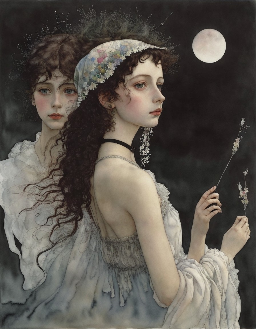 A painting of a woman with flowing hair and red lips, gazing to the side, with a pale moon in a dark sky behind her.
