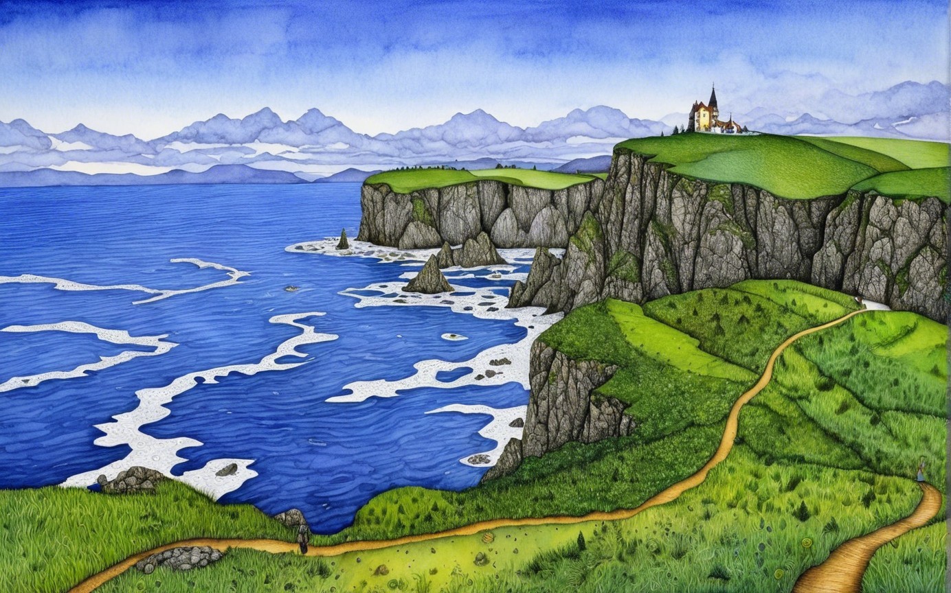 A vibrant coastal landscape features lush green hills, rocky cliffs, and a tranquil blue sea. A quaint cottage sits atop the cliffs, surrounded by a serene sky and distant mountains.