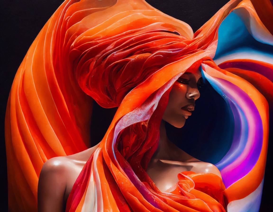 The image features two stylized figures intertwined with vibrant, flowing fabrics in shades of orange, red, and blue, creating a dynamic and ethereal effect against a dark background.