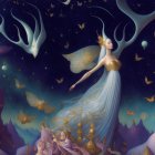 A serene, ethereal figure adorned in flowing garments stands against a dreamlike landscape. Surrounded by whimsical creatures and celestial elements, she embodies a mystical, enchanting presence.