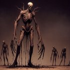 The image depicts a dark, eerie scene with a towering skeleton figure surrounded by smaller skeletons. The figures have elongated limbs and are set against a shadowy, foreboding background...