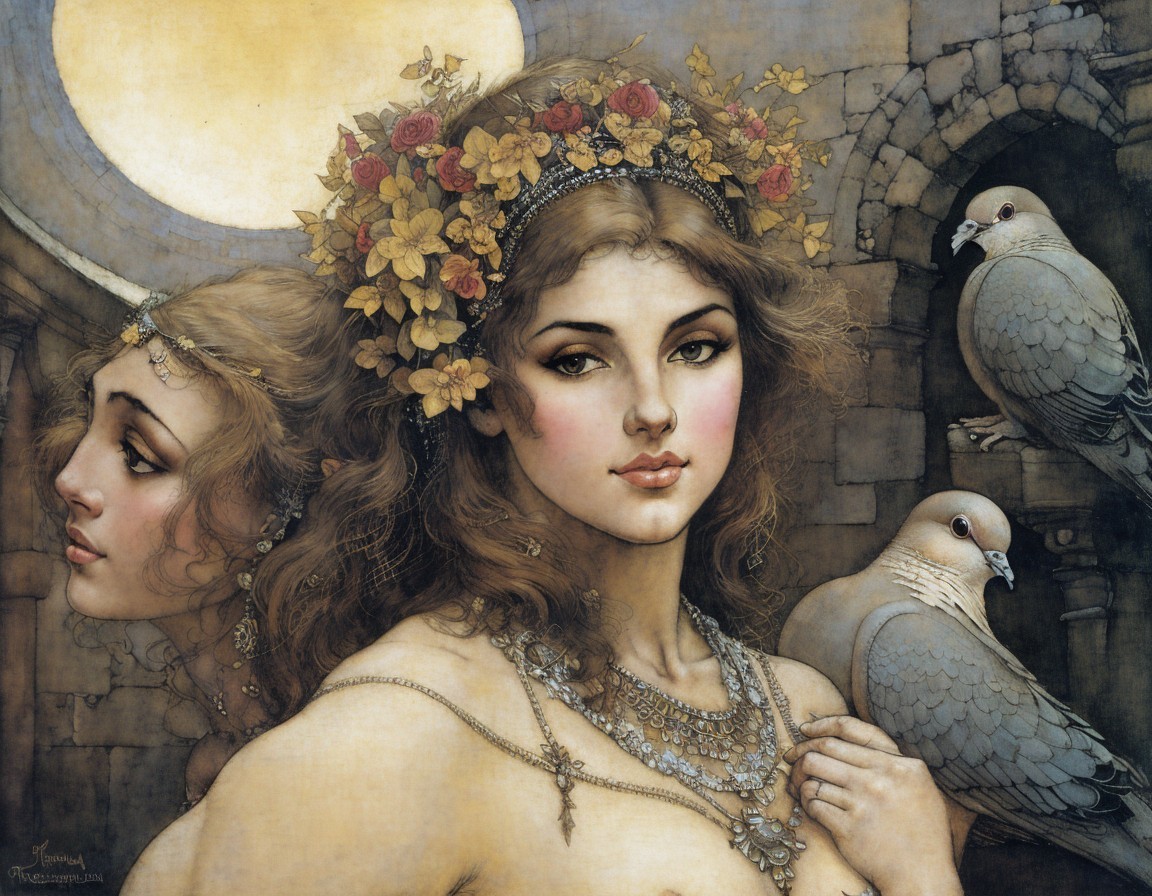A painting of a woman with a wide-brimmed hat, melancholic gaze, and two pigeons perched on her hand against an old city backdrop.