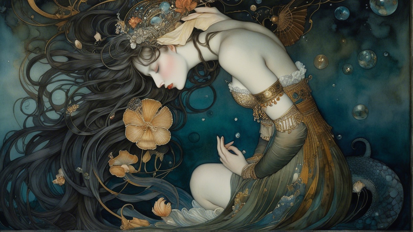 A serene underwater scene features a flowing-haired woman in a shimmering gown, gracefully holding a globe amidst colorful fish and a tranquil blue backdrop, evoking a sense of dreamlike beauty.