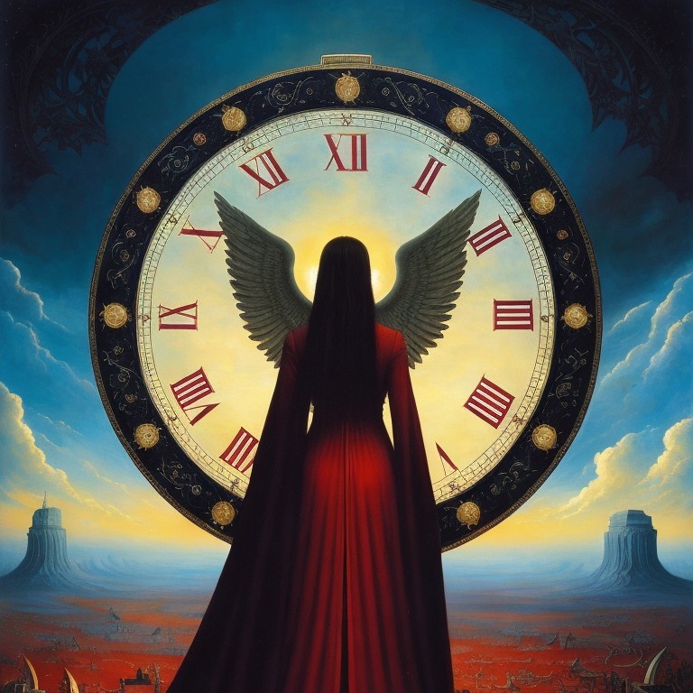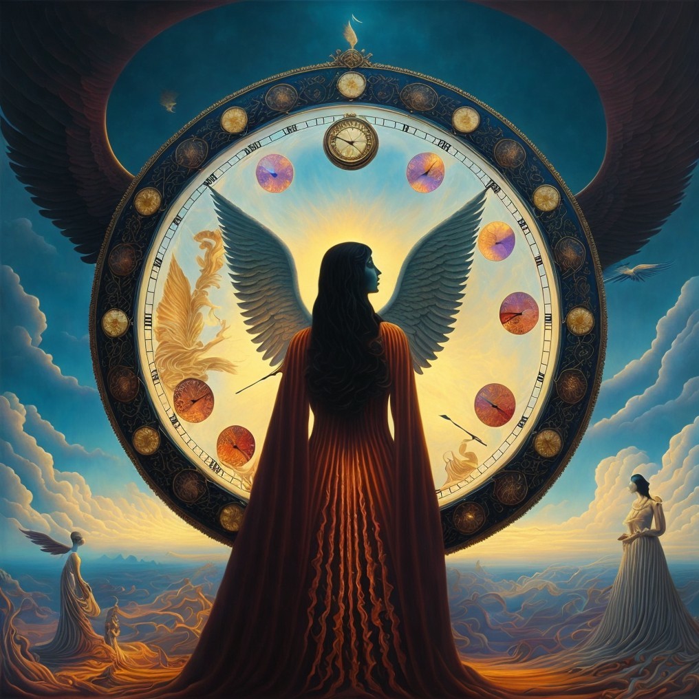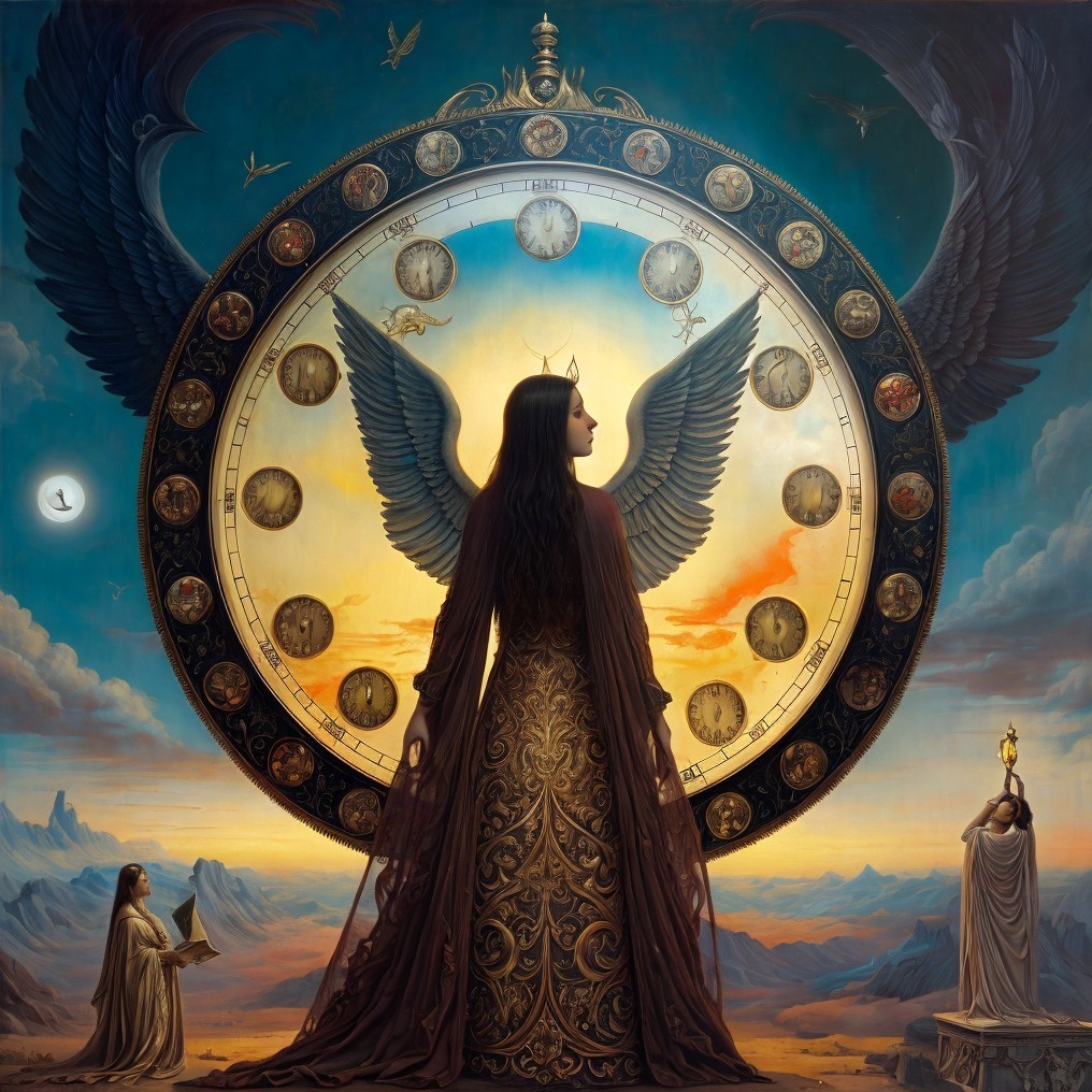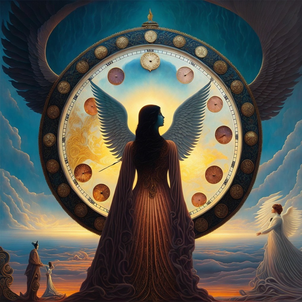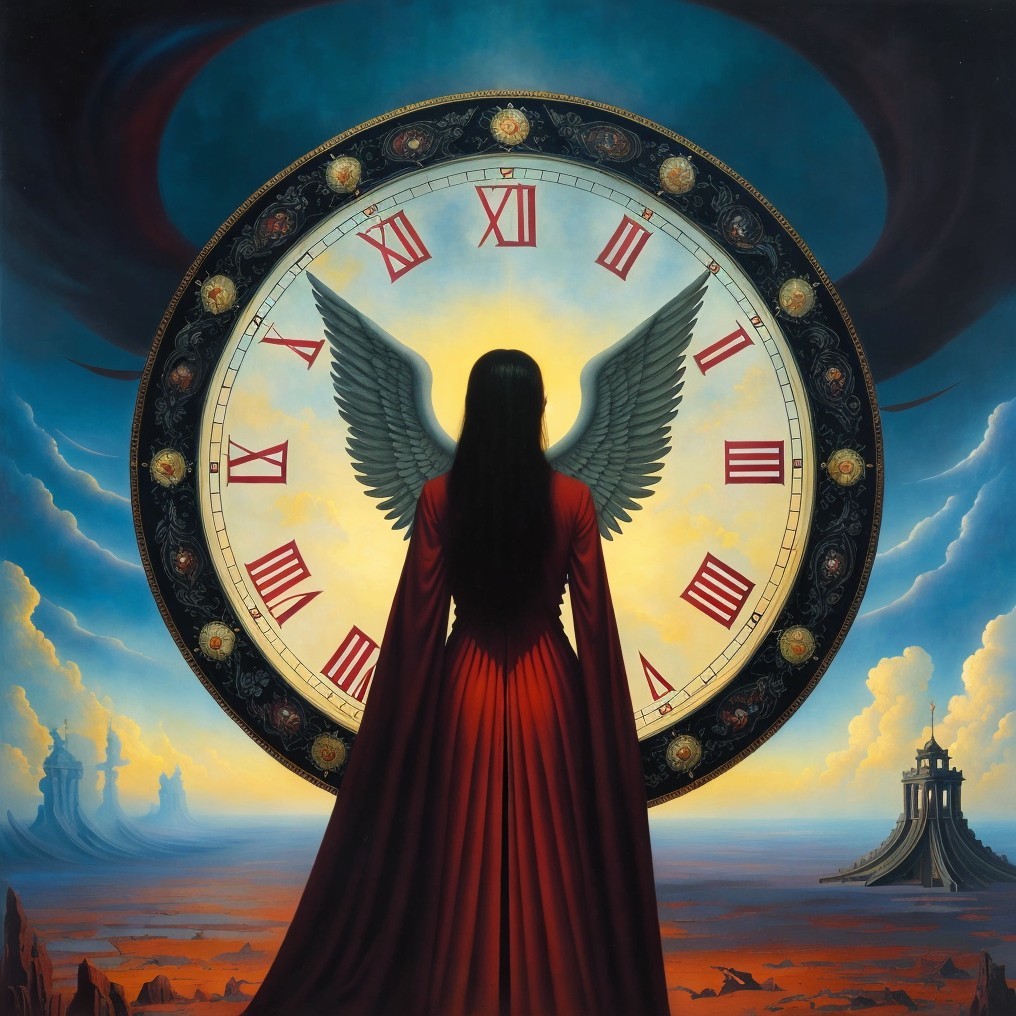 A woman stands before a giant clock with wings, accompanied by a small figure, amidst a surreal, celestial background.