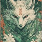 Detailed close-up digital painting of a majestic fox's head, facing forward, with captivating bright emerald green eyes that are the focal point. The fox has a prominent red-orange face mask, with a lighter, creamy white blending into the fur around its eyes and snout. Its fur elsewhere is