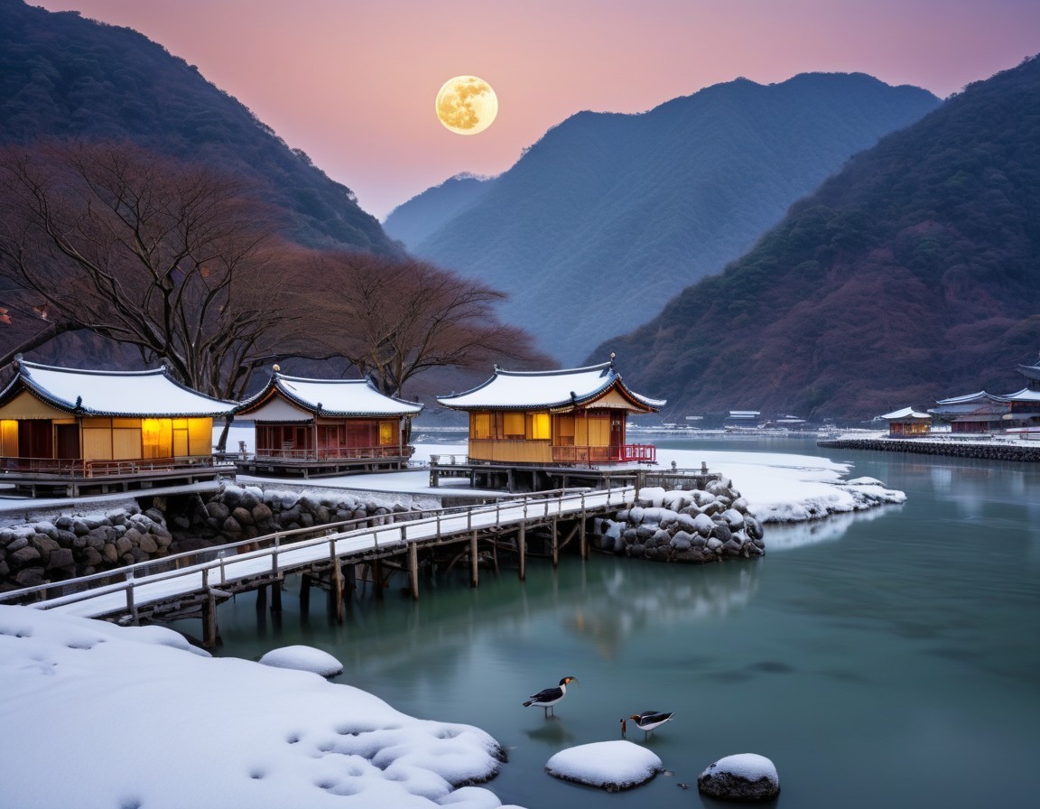 Traditional Asian buildings by a snowy riverside under a full moon with mountains in the background and a boat on the water.