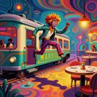 A highly detailed, colorful, and trippy digital painting in a comic book art style, portraying a man holding an open book against a chaotic, psychedelic background of swirling patterns. The man, a full-body portrait, is centered in the frame. He has dark skin, a neatly trimmed black beard