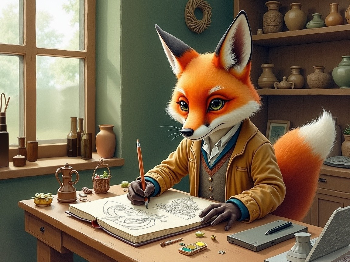 A whimsical anthropomorphic fox in a cozy artist's studio sketches in a book. Surrounded by pottery and art supplies, it wears a formal coat, embodying creativity and charm.