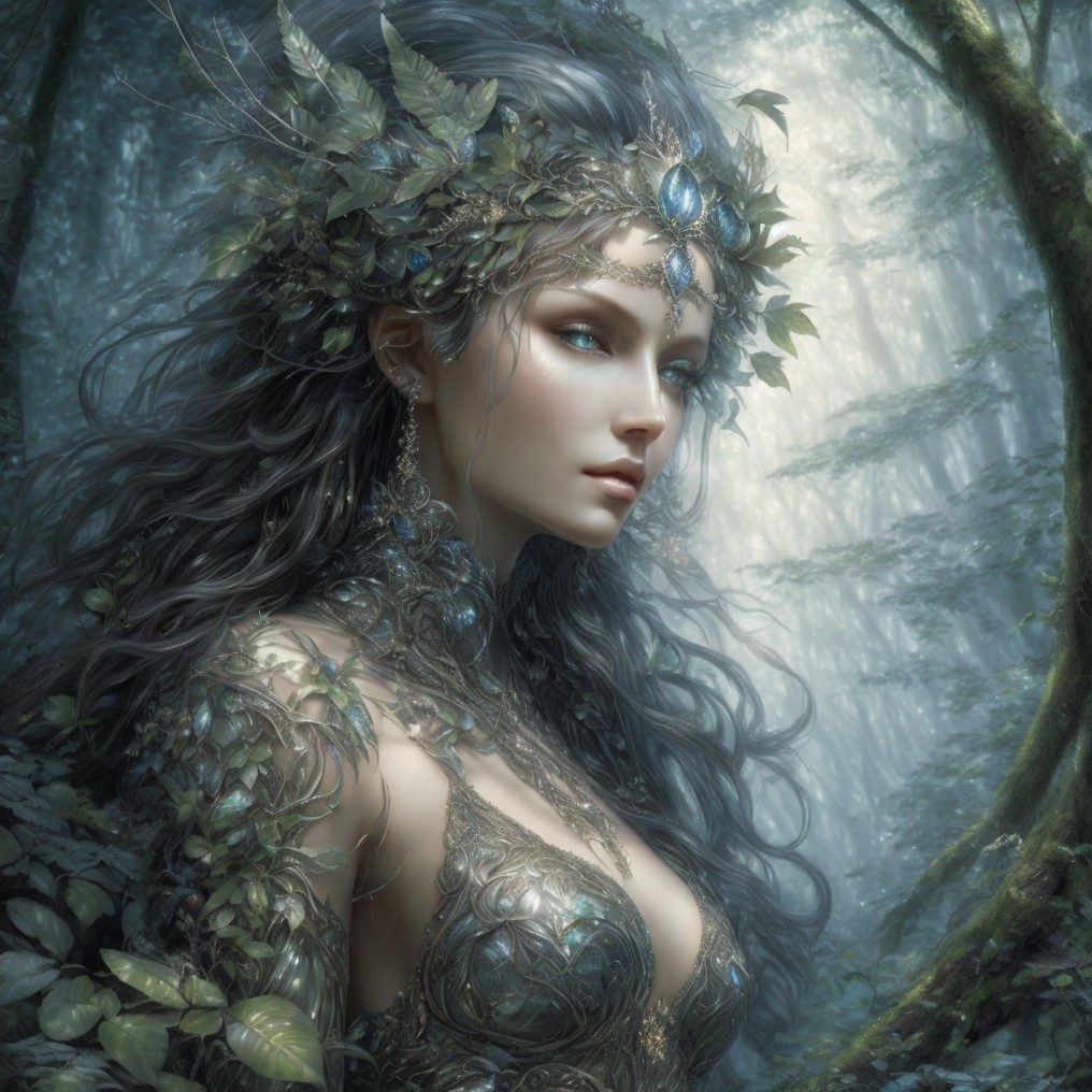A mystical woman with leafy adornments emerges from an ethereal forest, embodying the essence of nature's magic and beauty.