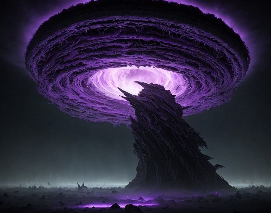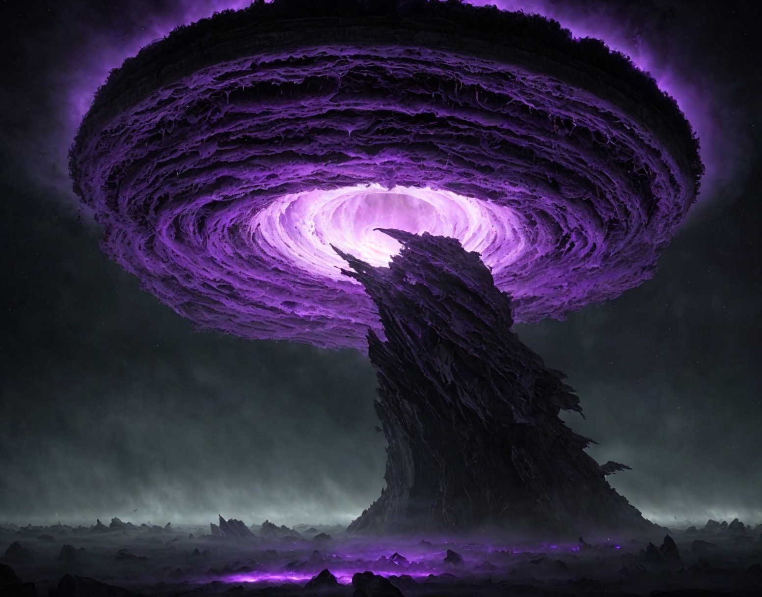 A colossal, swirling purple vortex hovers above a jagged rock formation on an alien landscape. A solitary figure stands nearby, gazing up in awe at the mesmerizing, cosmic spectacle.