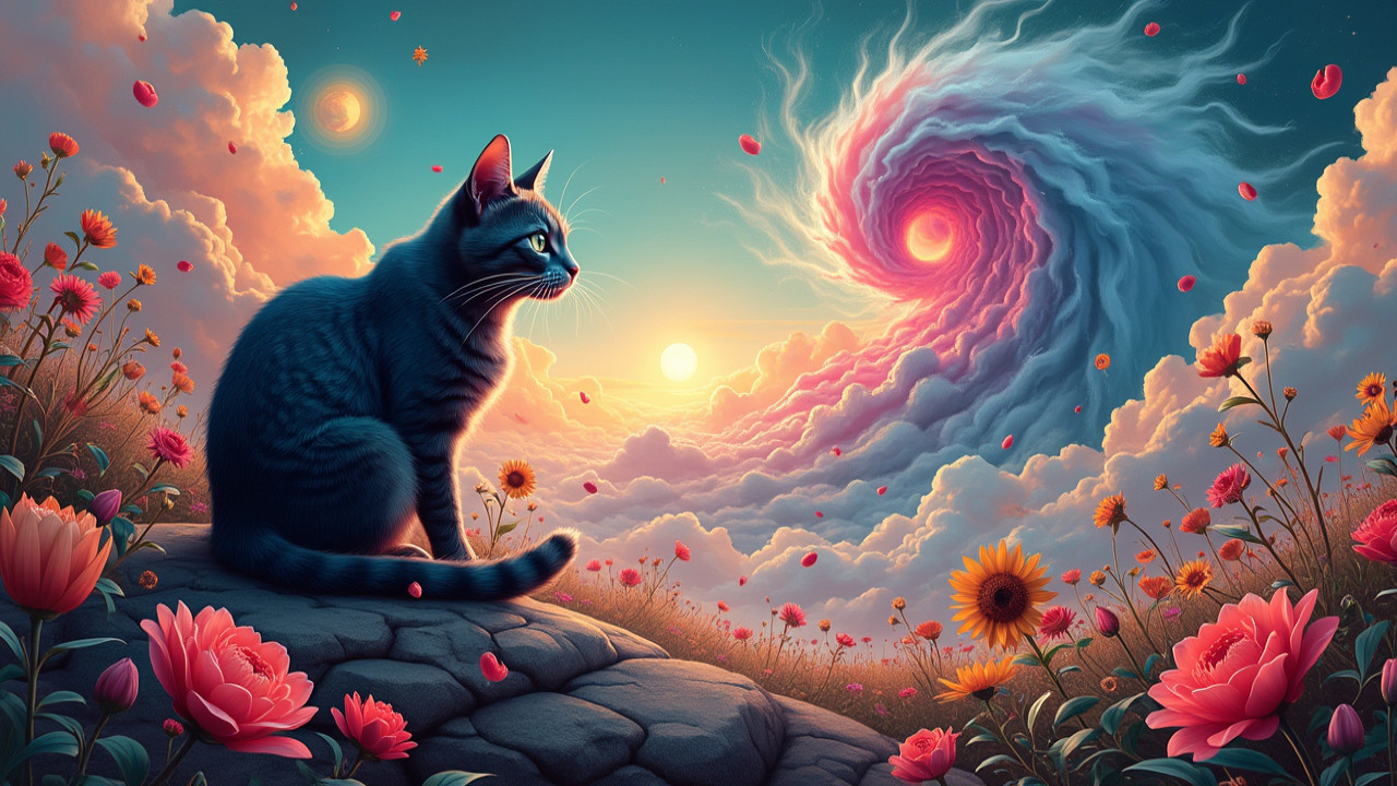 vibrant digital wallpaper of Schrödinger's cat,half in shadow,half in light,whimsical elements floating around,playful clouds,giant flowers,spirals of color,surreal dreamlike landscape;8k resolution,highly detailed,concept art,sharp focus,inspired by surrealism,modern fantasy,rich textures,imaginative patterns