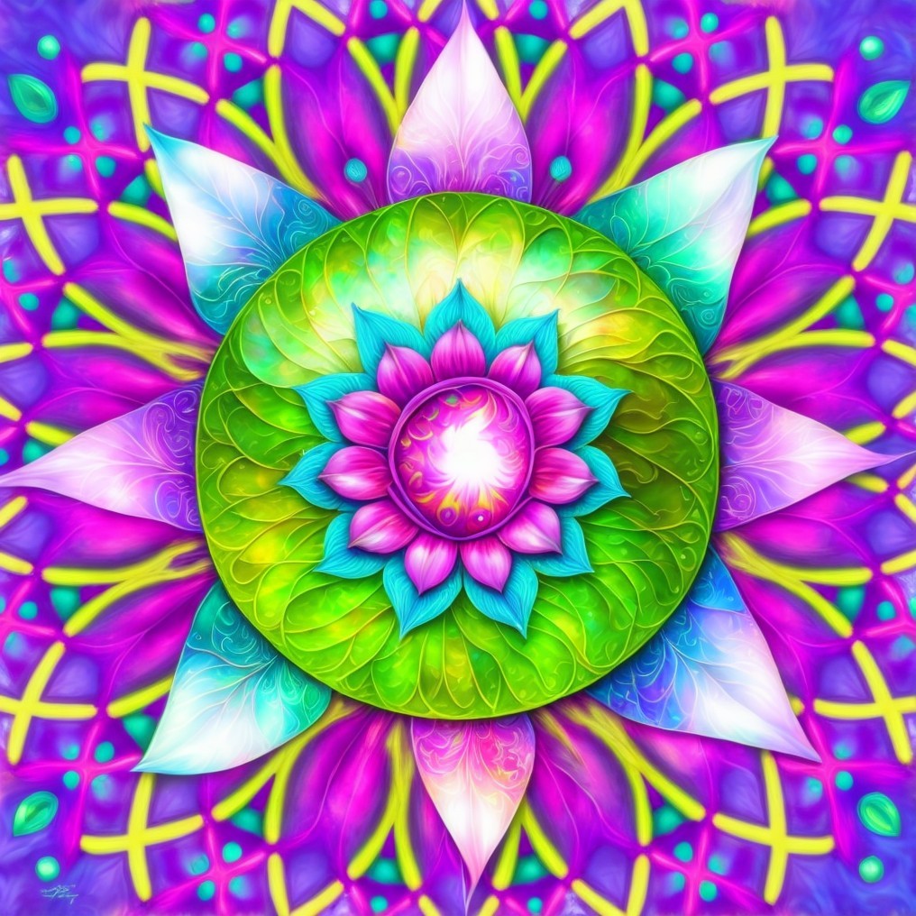 A vibrant, intricate mandala featuring a central lotus flower surrounded by swirling petals in shades of purple, turquoise, and green, creating a harmonious and mesmerizing pattern.