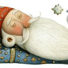 A jolly Santa with a fluffy white beard and a red hat lounges amid festive decorations. Surrounded by gifts, greenery, and cute animals, he embodies the spirit of Christmas cheer.