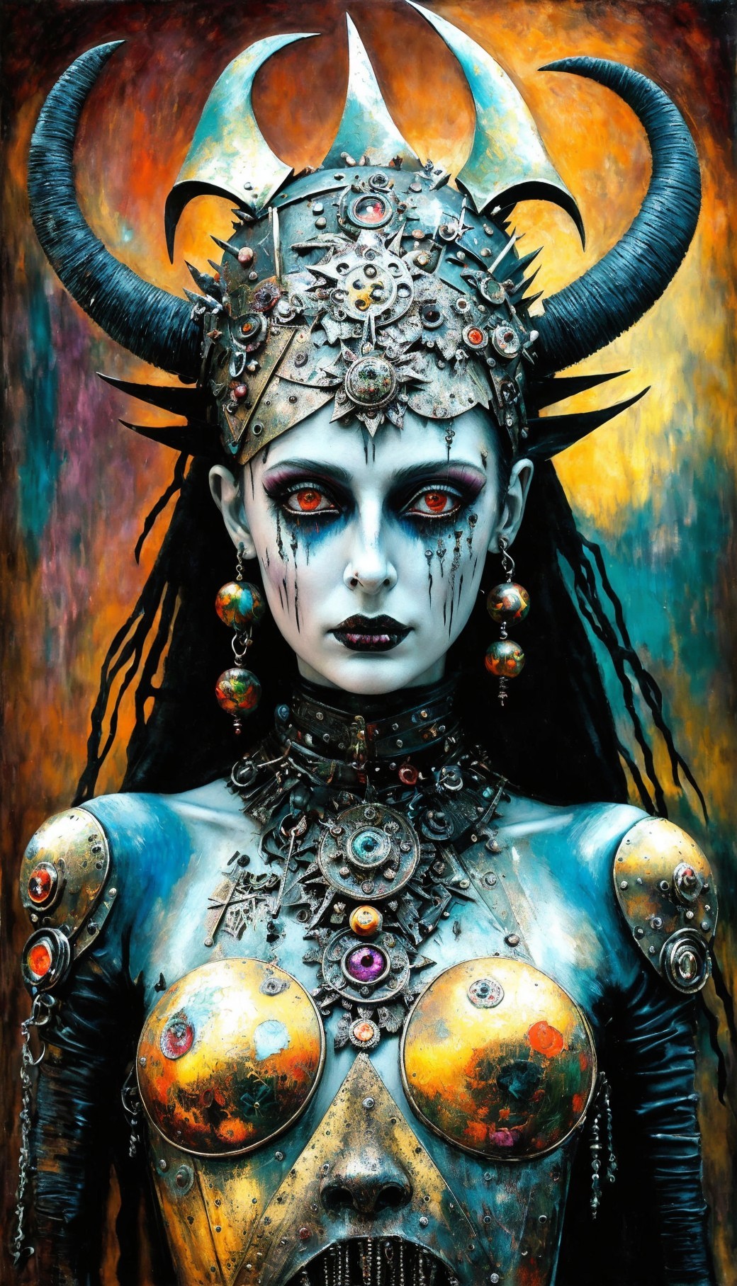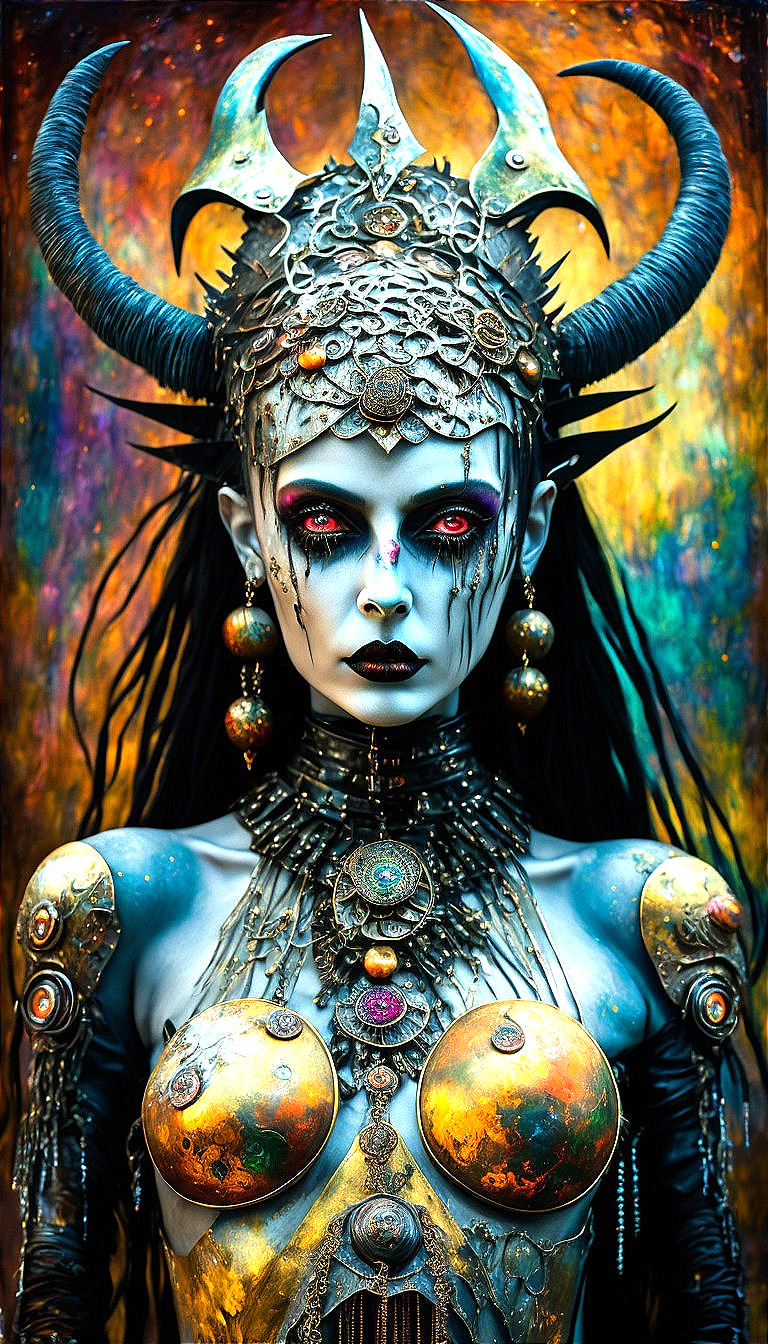 A person wearing elaborate fantasy makeup and a costume with horns, jewels, and metallic adornments against an abstract background.