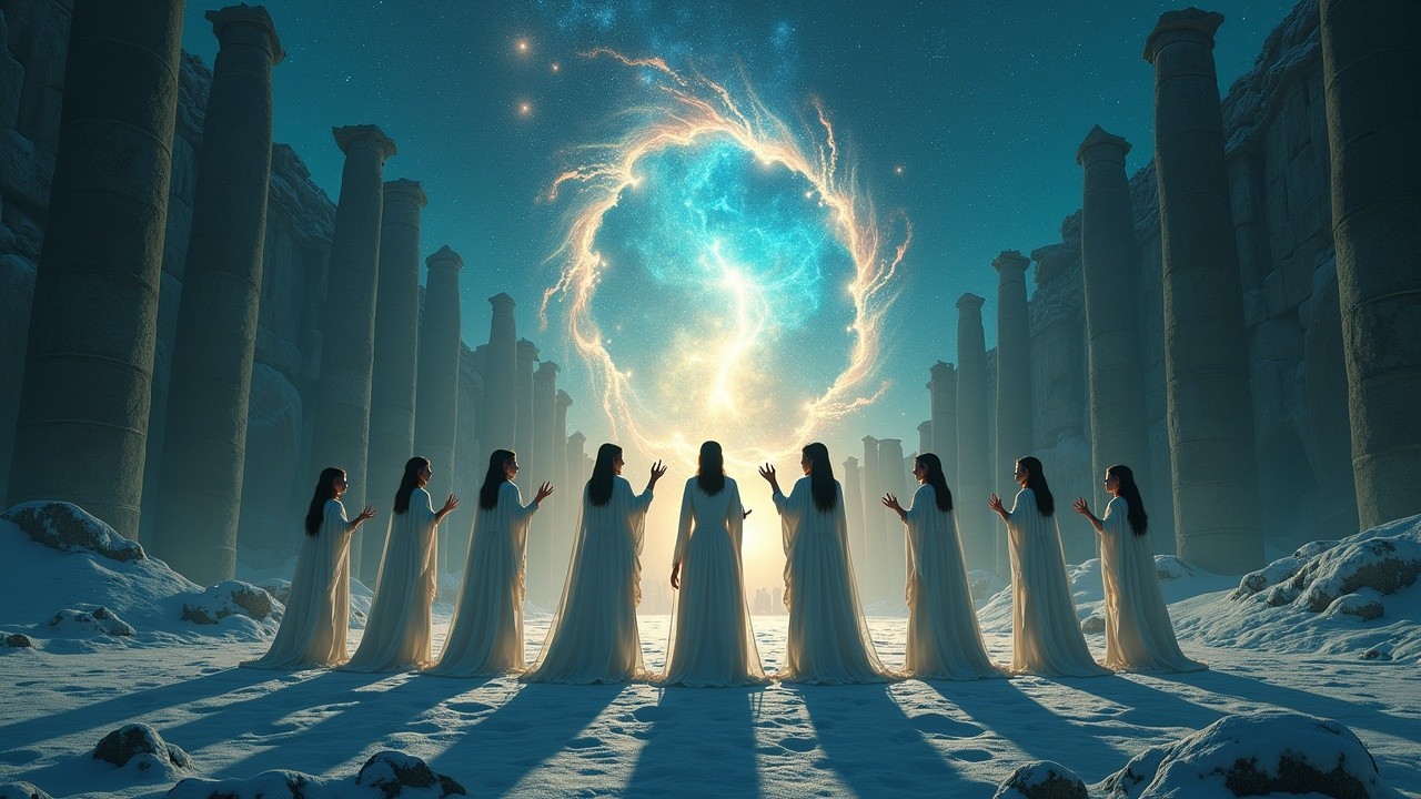A group of ethereal figures in flowing white robes stands on a snowy landscape, arms raised towards a glowing portal. The celestial background features a starry sky and vibrant cosmic colors.