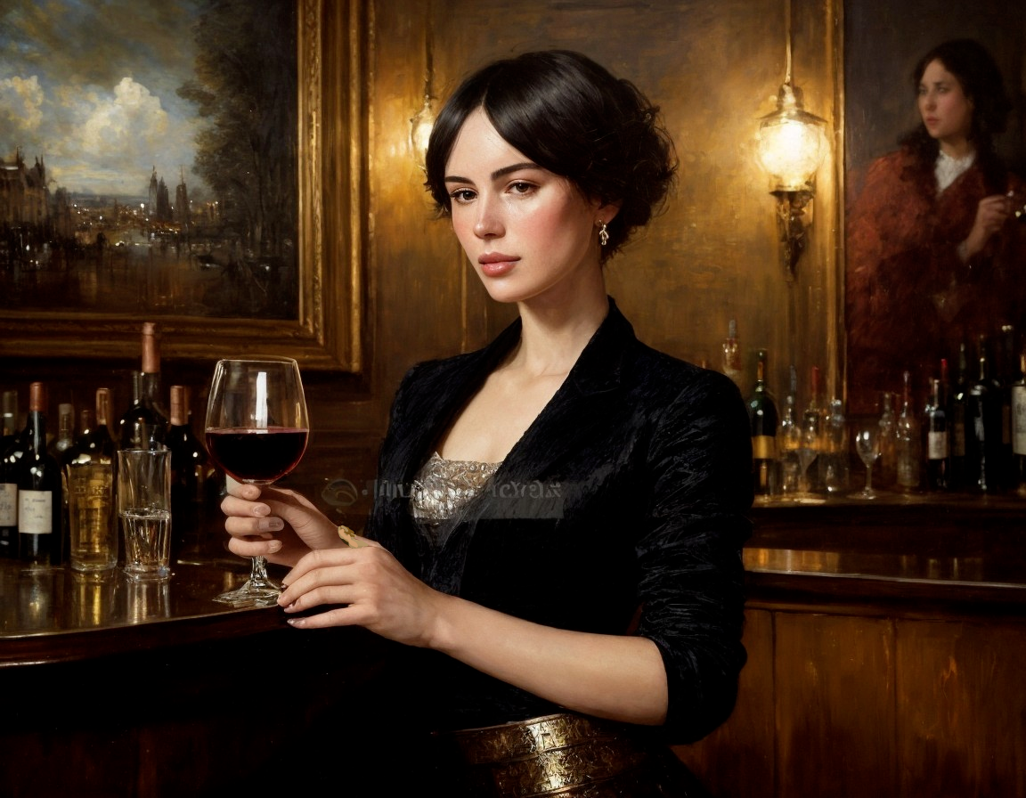 A woman in an elegant dress holds a wine glass, with a bar scene and another person in the background. It appears to be a painting.
