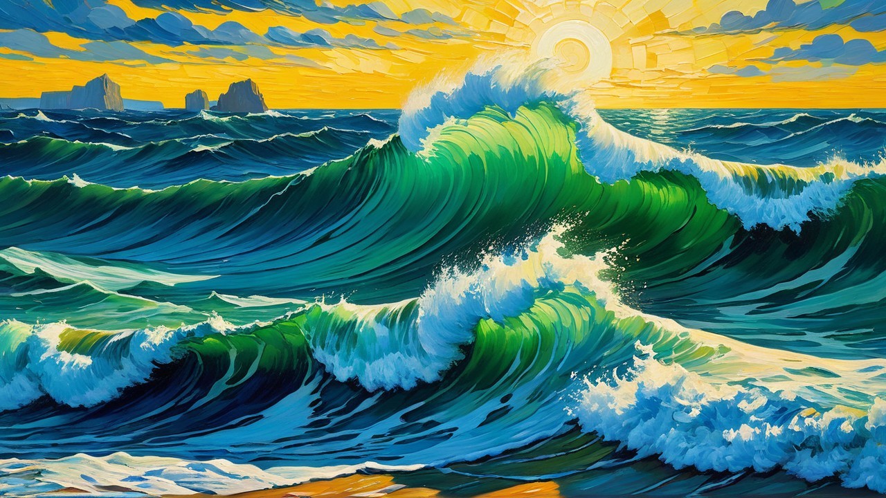 A radiant sunrise over a choppy, abstract ocean, with a burst of sunlight at the top right, and the sky is filled with broad, thick strokes of brilliant yellow and short, thick strokes of blue and gray clouds. The sea is a swirling, vibrant green, deep blue, turquoise, and white