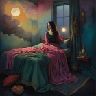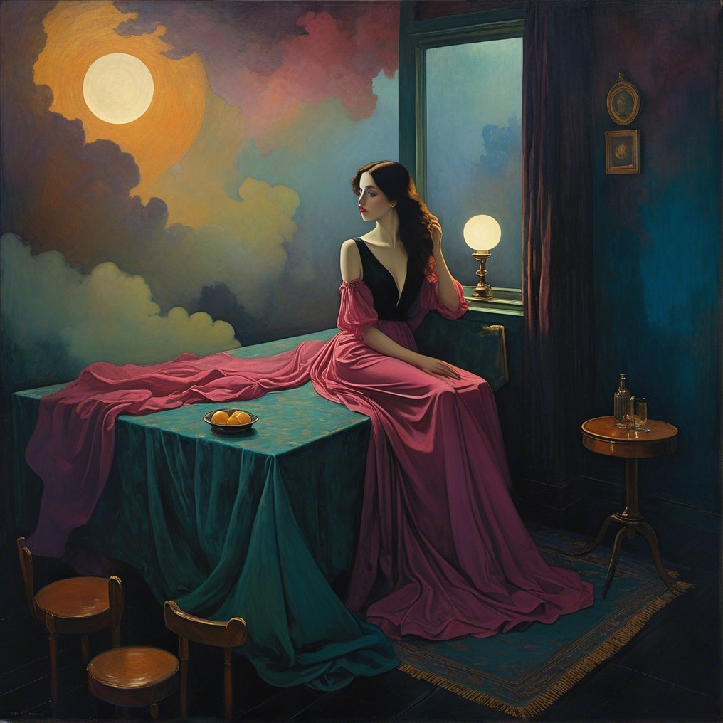 A woman in a flowing pink dress sits elegantly on a bar, gazing out the window. Soft lighting and rich colors create a nostalgic, intimate atmosphere, complemented by a bottle and glasses nearby.
