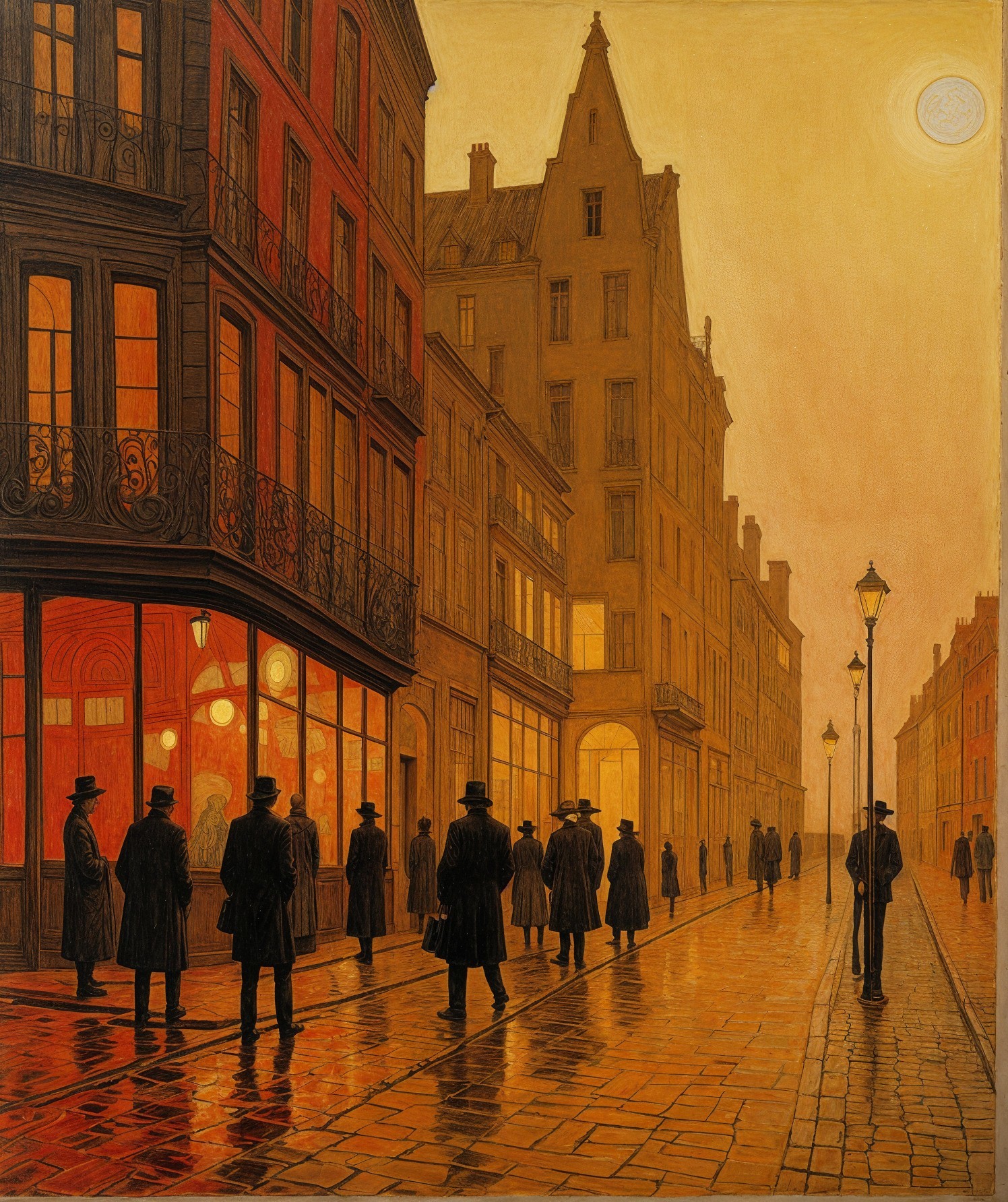 A dimly lit street scene at dusk, with people in long coats and hats standing near elegant buildings. Glowing windows and street lamps cast a warm, inviting light on the wet cobblestones.