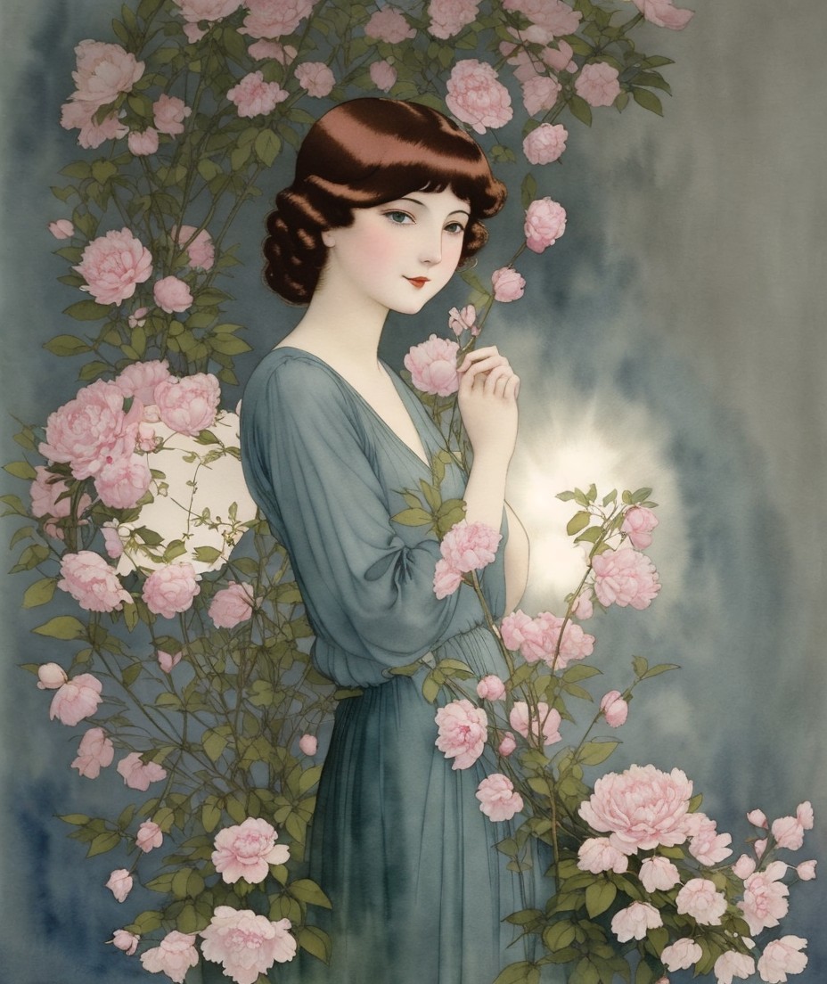 An illustration of an elegant woman in vintage attire, donning a wide-brimmed hat adorned with flowers, and holding a floral bouquet.