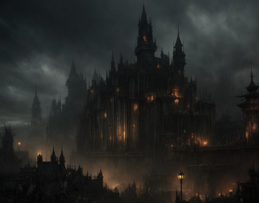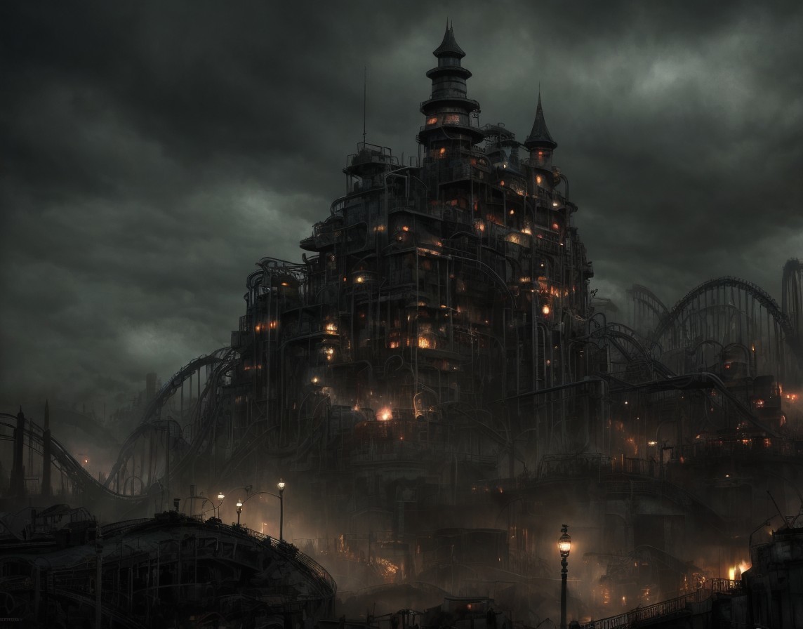 A dystopian industrial cityscape at dusk with towering structures, glowing windows, and roller coasters under a brooding sky.