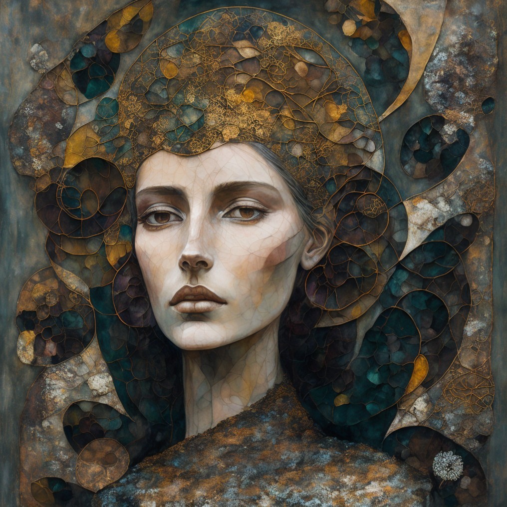 A painting of a woman with geometric patterns on her hat and a solemn expression, rendered in muted earth tones.