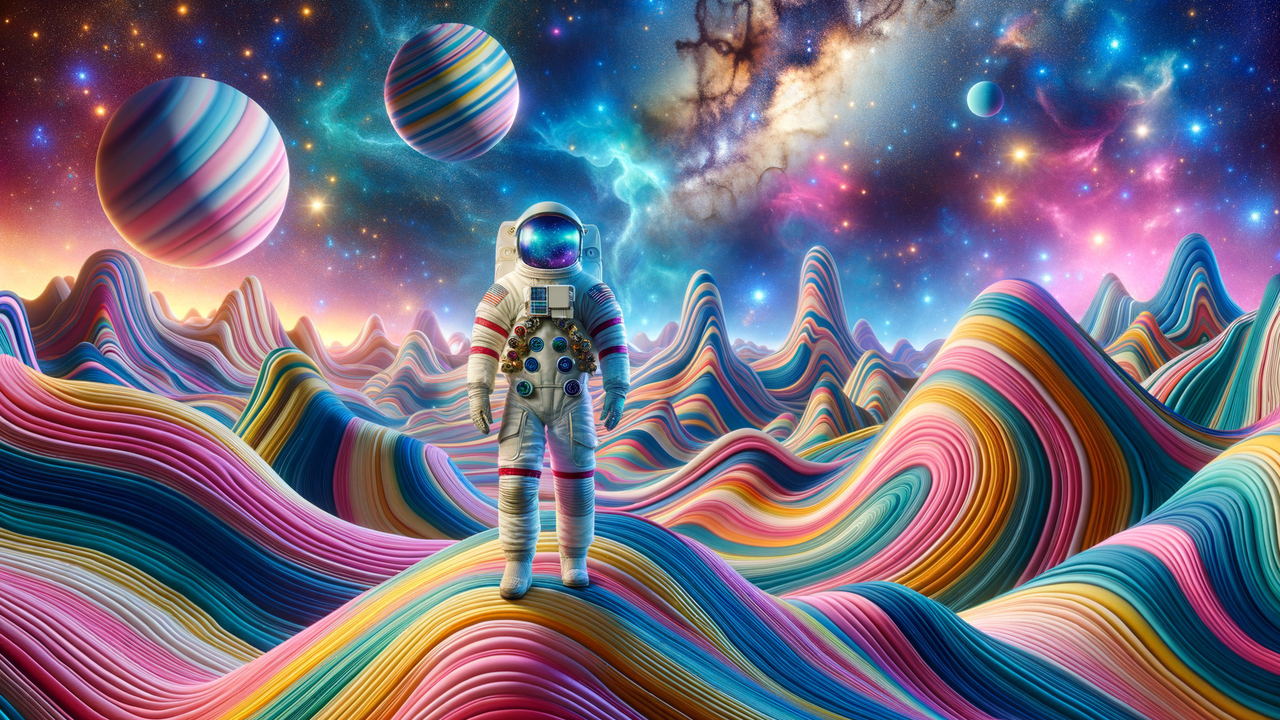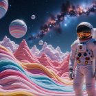 An astronaut stands centered in a full shot on a multi-colored, candy-striped landscape with large hills that flow like ribbons. The astronaut wears a white spacesuit with red and blue accents, a helmet that reflects a starry nebula, and a chest piece adorned with colorful buttons. In the background are