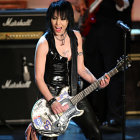 A tattooed female guitarist performs passionately on stage, wearing a sleek black outfit. Surrounding her are bandmates, illuminated by vibrant stage lights, creating an energetic atmosphere.