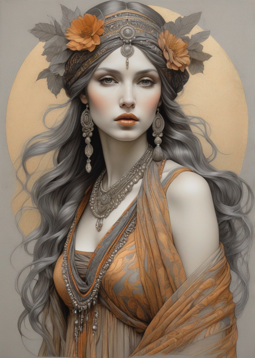 A digital artwork of a woman adorned with a headpiece, jewelry, and draped in orange, set against a golden halo backdrop.