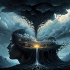 A surreal scene features a woman's profile, her hair transforming into a cityscape atop swirling clouds, contrasting a vibrant sunset and intricate urban details below.