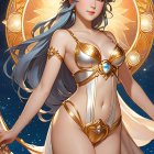 A striking woman poses confidently in a stylish lingerie outfit against a large, glowing full moon. Her elegant hair is complemented by a flower accessory, creating a captivating celestial atmosphere.
