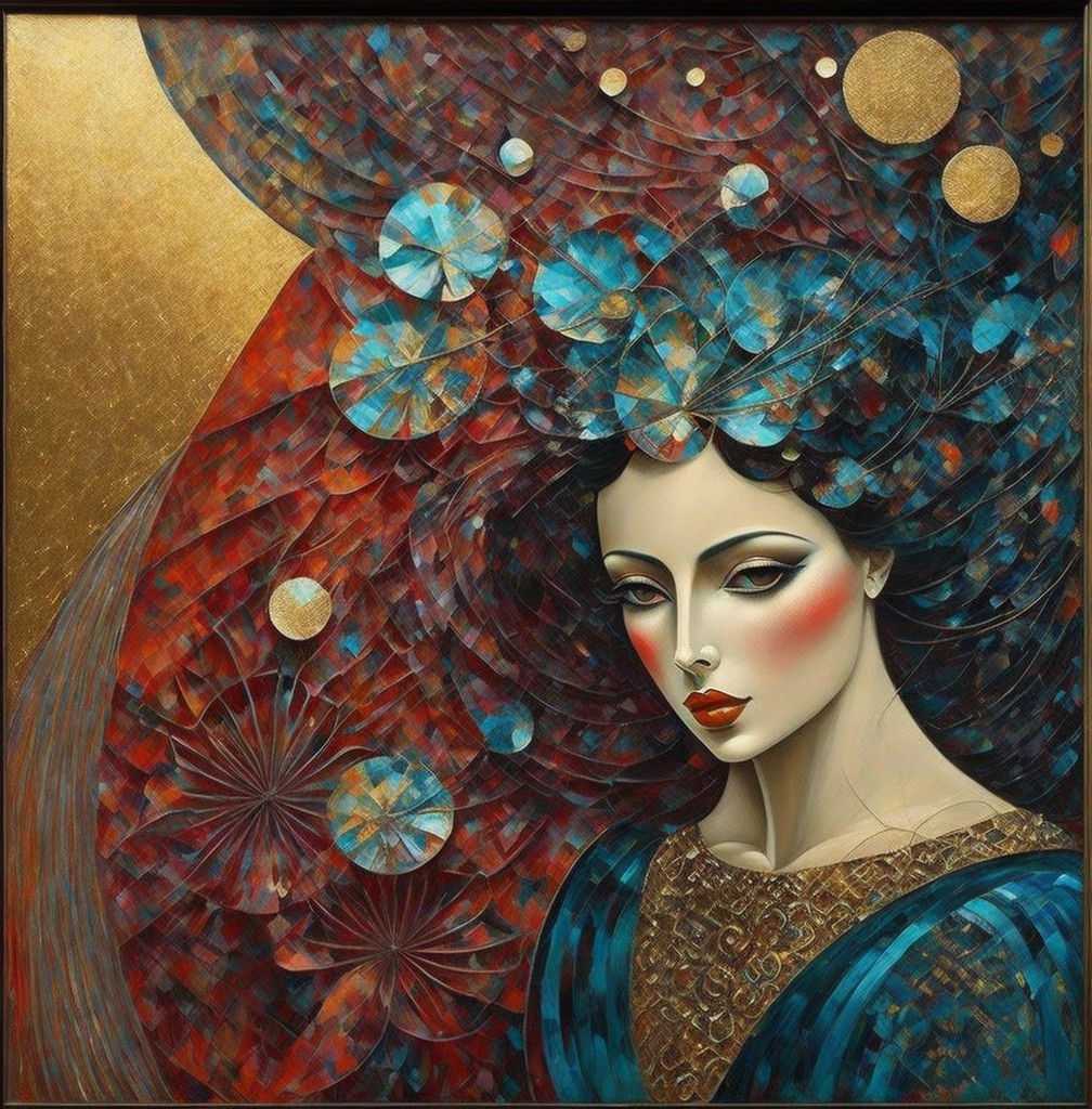 The artwork features a woman with an elegant expression, adorned in rich colors and intricate patterns, set against a backdrop of swirling motifs and geometric shapes in vibrant hues.