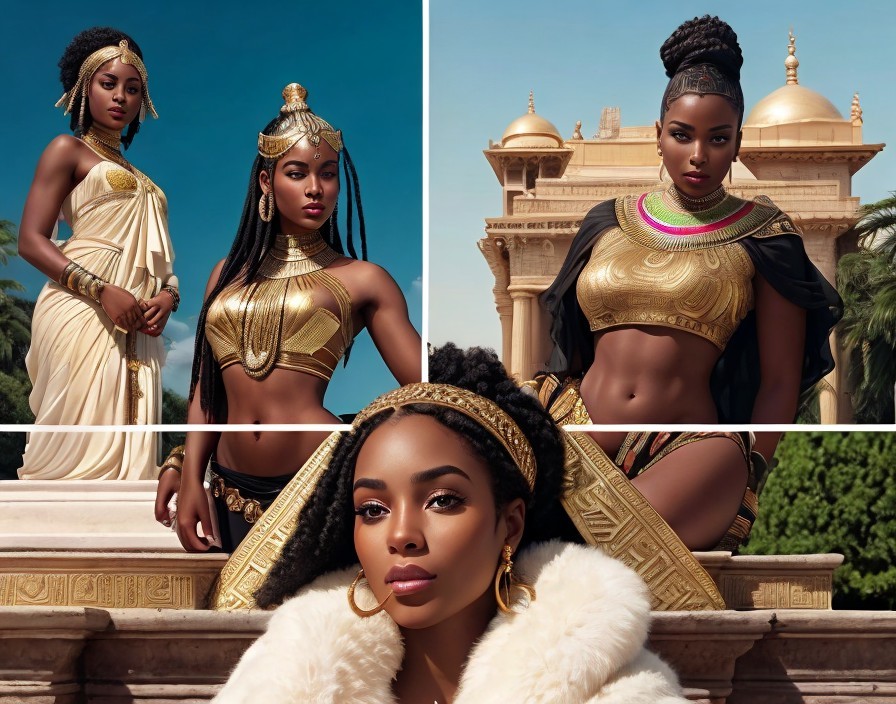 A collage of three poses featuring a woman in golden, regal attire, reminiscent of a stylized ancient Egyptian queen, set against a palatial backdrop.