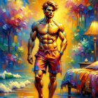 A whimsical autumn scene features a woman in a black and orange outfit, holding a pumpkin. Behind her, a heart-shaped sunset, bats, and trees with vibrant leaves enhance the Halloween spirit.