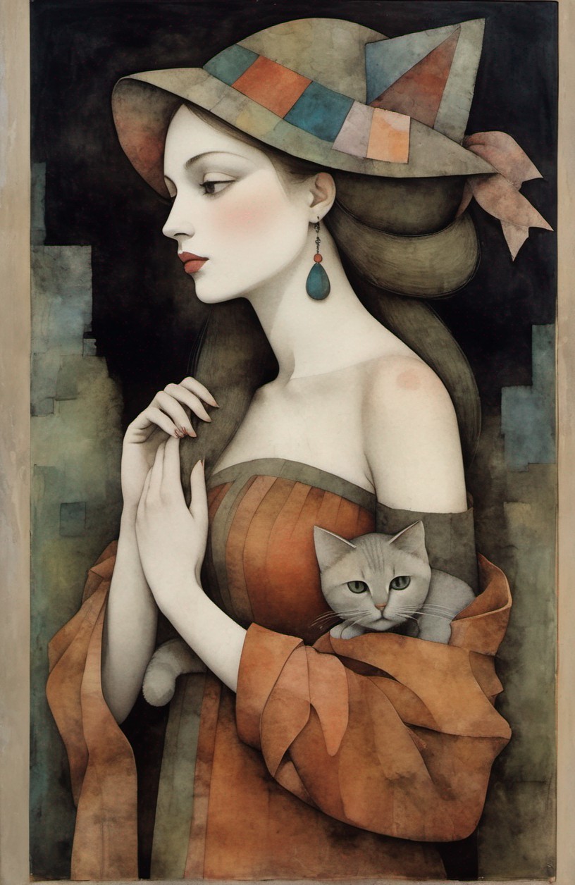 Beautiful woman with a cat hat, portrait in sienna, patina of ancient stone with moss, art brut, moody, somber, desaturated colors, in the style of Paul Klee, Arthur Rackham