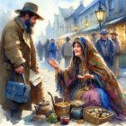 In a quaint street, a man in a hat converses with a woman in period attire, who holds a cup. Gas lamps illuminate the scene, depicting a lively market atmosphere. People stroll in the background.