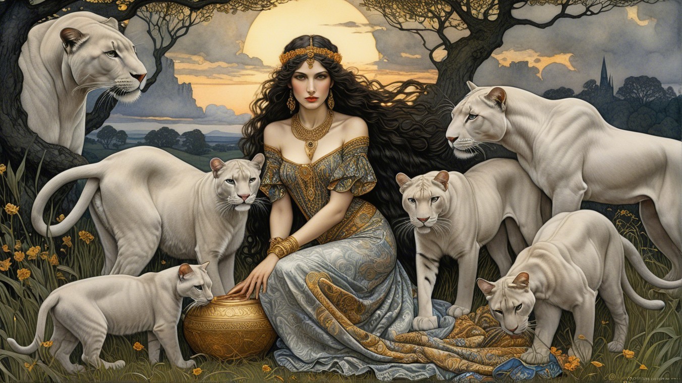 A regal woman in a flowing, ornate gown sits among three white lions under a golden sunset. Surrounded by lush greenery and flowers, she exudes grace and strength, embodying nature's majesty.