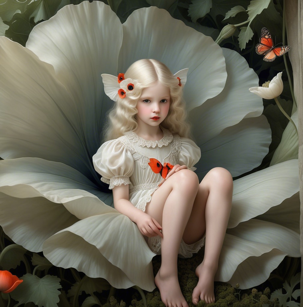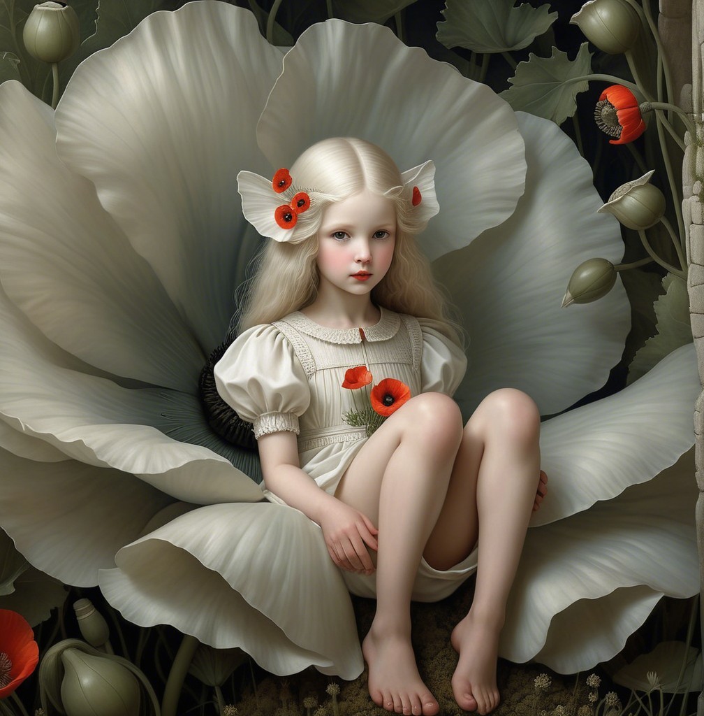 A mystical young girl with pale hair sits gracefully inside a large white poppy flower, adorned with red petals, creating a dreamlike, enchanting atmosphere.